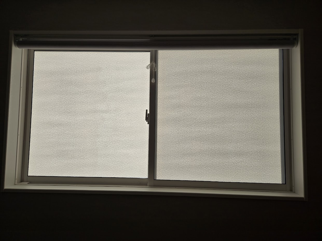元々、すりガラスに貼りましたので、施工後に模様のような見た目になりましたが、日中、夜間共に外からの採光を遮りますので、眩しさが抑えられます。