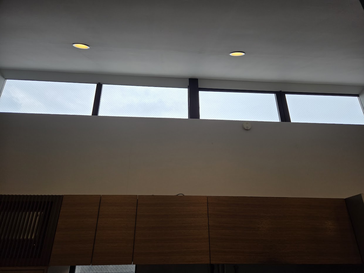 東京都世田谷区の戸建ての高所の窓ガラスに透明UVカット遮熱、断熱フィルムを貼りました。