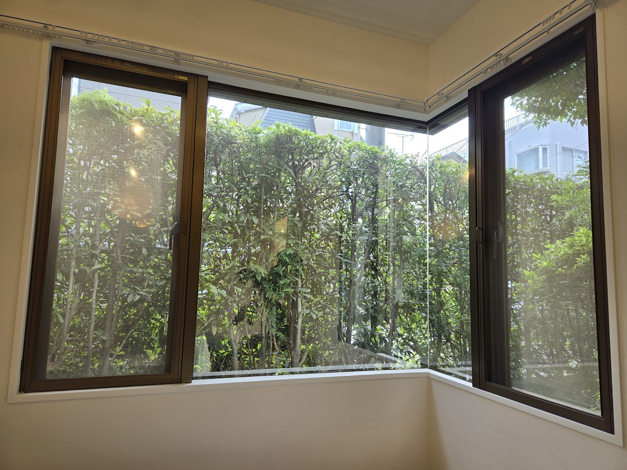 今回は、窓の外に植物があり、少し室内と外の明るさの差が少なくて、室内の映り込みも増えていますが、外から室内は見えにくくなっています。
